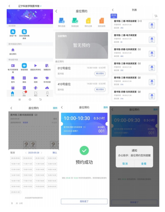 ①预约流程:登录移动图书馆APP,在首页右上角输入邀请码“lnkjxytsg”进入图书馆页面,点击【图书馆座位预约】功能。每日16:00后,可在系统内选择未来时段及心仪座位。