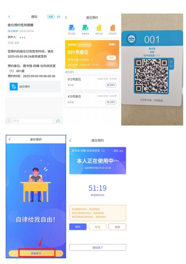 ②签到要求:需于预约时段开始前30分钟内到馆,使用学习通APP首页右上角“扫一扫”功能,开启手机蓝牙扫描座位专属二维码完成签到。逾期未签到者,系统将自动释放座位资源。